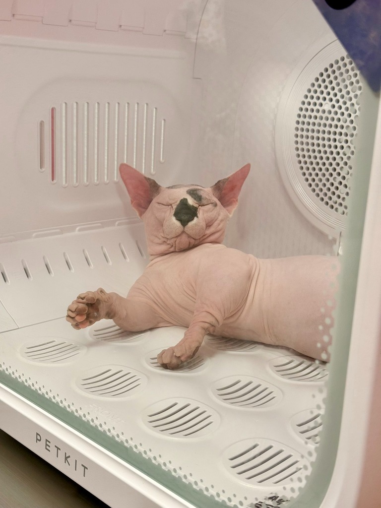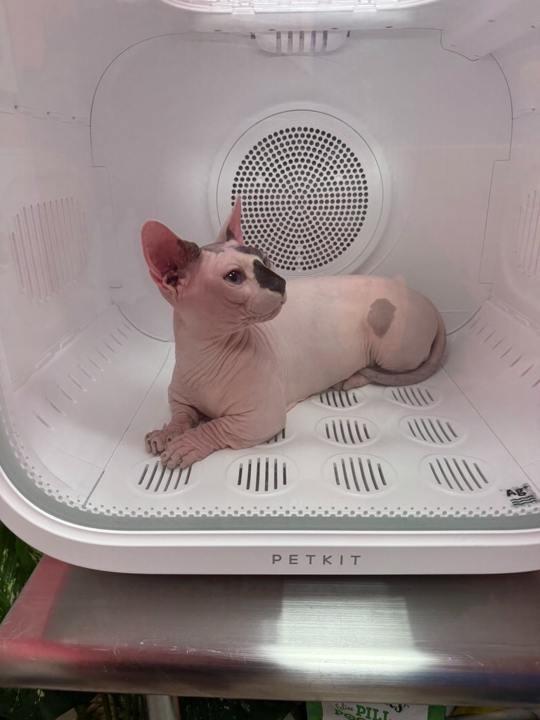 The Sphynx are considered hairless, but do have what we would describe as peach fuzz fur. They are known to be exceptionally greasy as they do not have coat to absorb natural oils produced by their skin. They require regular baths with gentle body and nail degreasing to keep their skin healthy and clean.