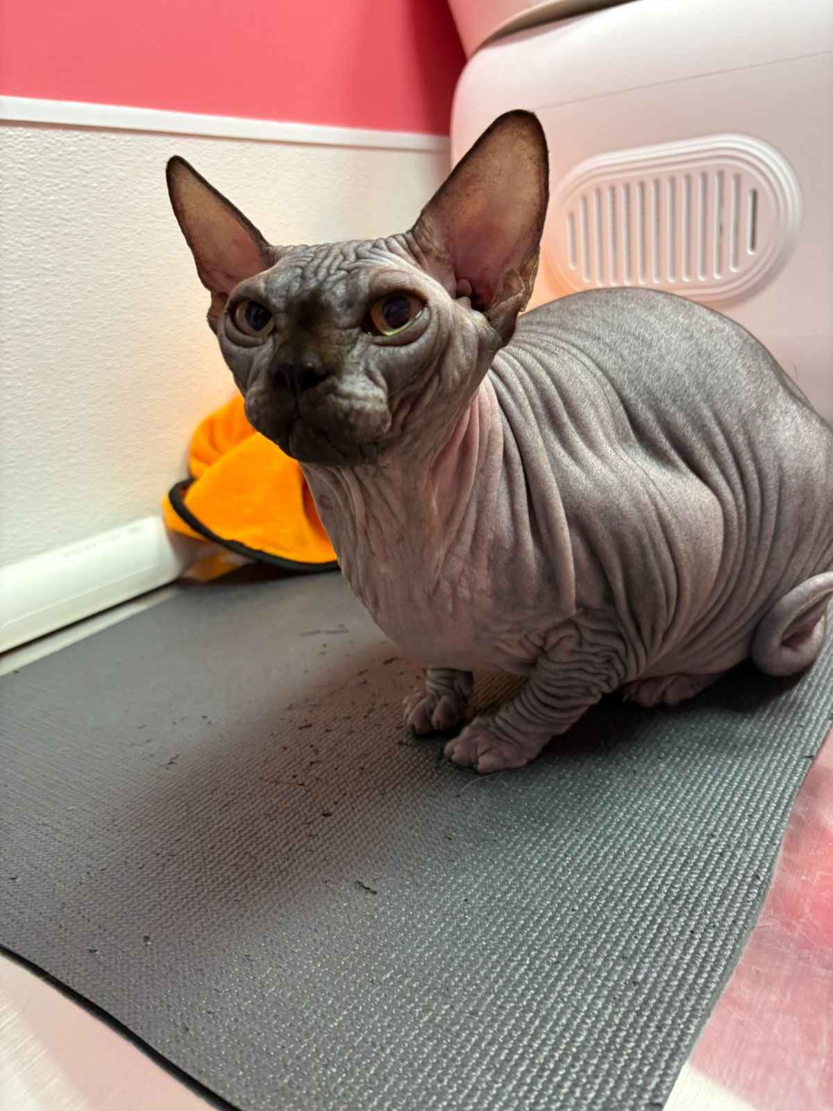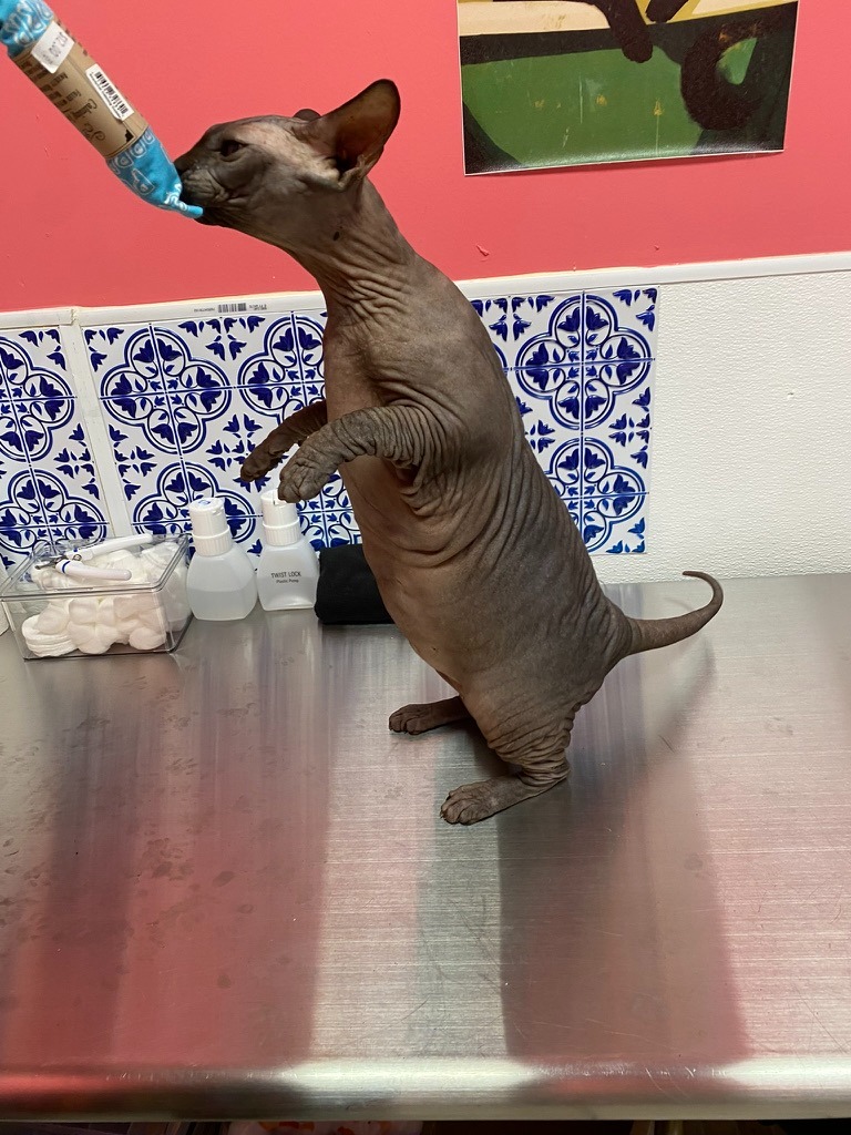 The Sphynx are considered hairless, but do have what we would describe as peach fuzz fur. They are known to be exceptionally greasy as they do not have coat to absorb natural oils produced by their skin. They require regular baths with gentle body and nail degreasing to keep their skin healthy and clean.